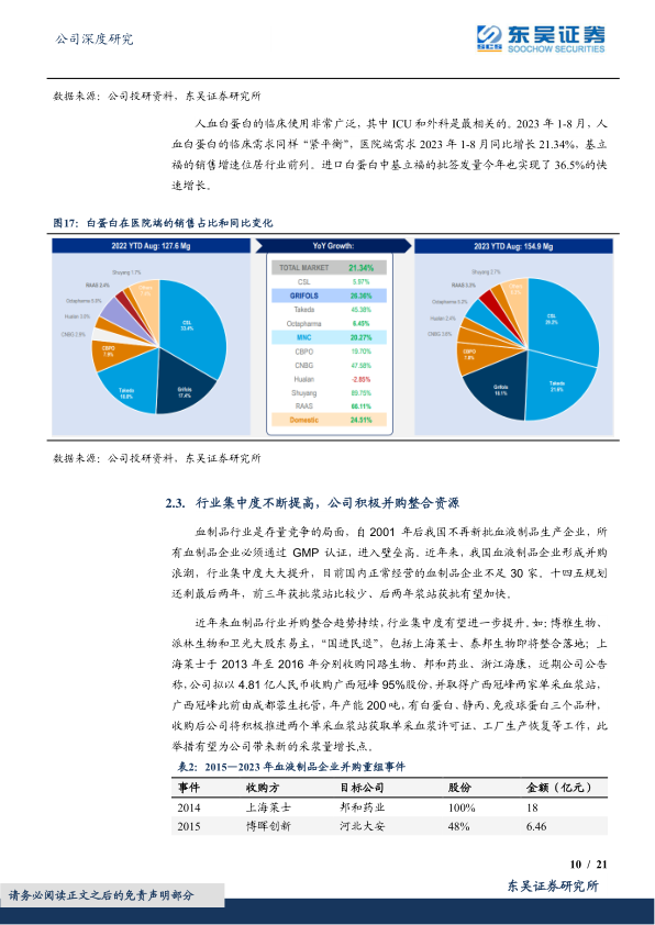 行业集中度不断提高,公司积极通过并购整合资源。自2001年后我国不再新批血液制品生产企业,行业进入壁垒高。公司通过收购同路生物、邦和药业、浙江海康等,并战略性收购广西冠峰95%股份,获得2家单采血浆站及血制品生产资质,进一步拓展浆源。