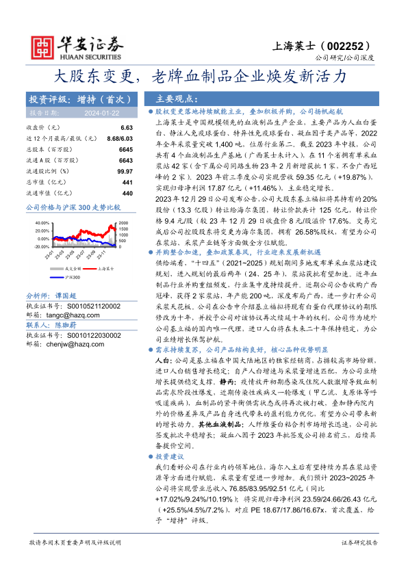 我们看好公司在行业内的领军地位,海尔入主后有望持续为其在浆站资源等方面进行赋能,采浆量有望进一步增加。我们预计2023~2025年公司将实现营业总收入76.85/83.95/92.51亿元(同比+17.02%/9.24%/10.19%);将实现归母净利润23.59/24.66/26.43亿元(+25.5%/4.5%/7.2%),对应PE18.67/17.86/16.67x,首次覆盖,给予“增持”评级。
