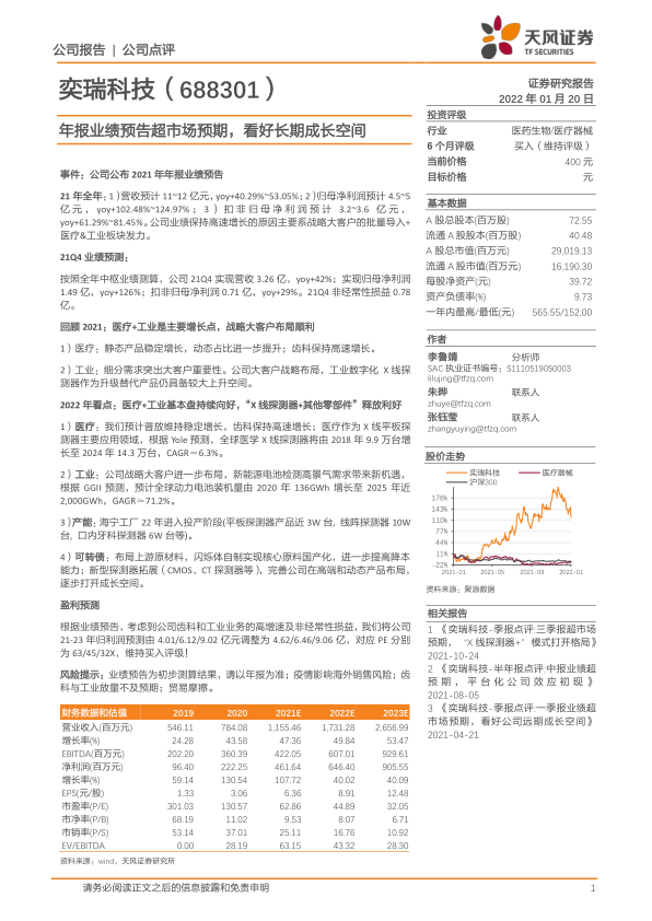本报告对奕瑞科技(688301)2021年年报业绩预告进行了解读,并维持“买入”评级。核心观点如下: