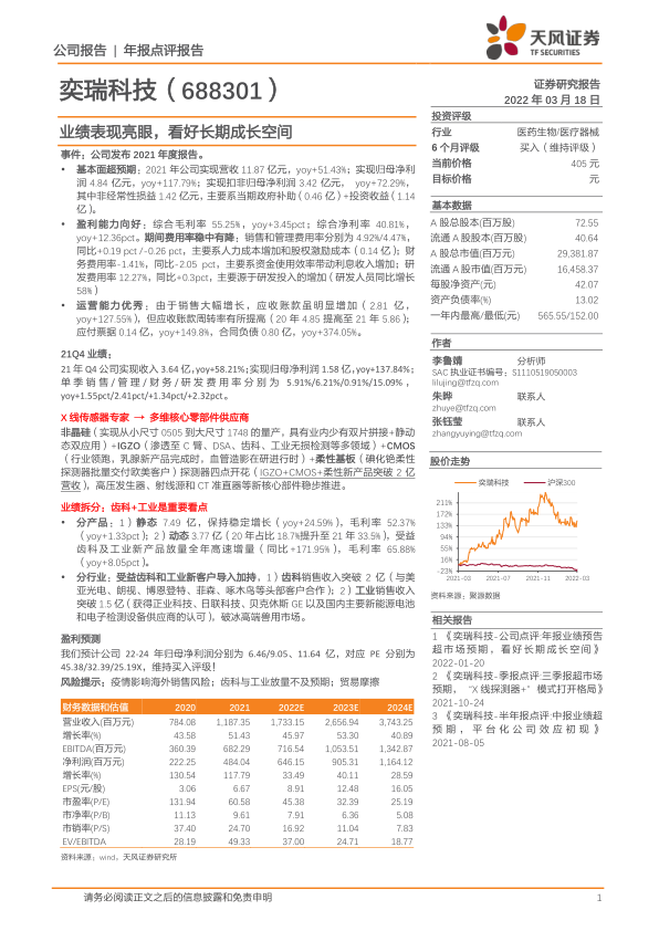 奕瑞科技2021年业绩表现亮眼,基本面超预期,盈利能力显著提升。公司在X线探测器领域不断创新,拓展多维核心零部件业务,齿科和工业市场成为新的增长点。维持买入评级,但需关注疫情、市场放量和贸易摩擦等风险。