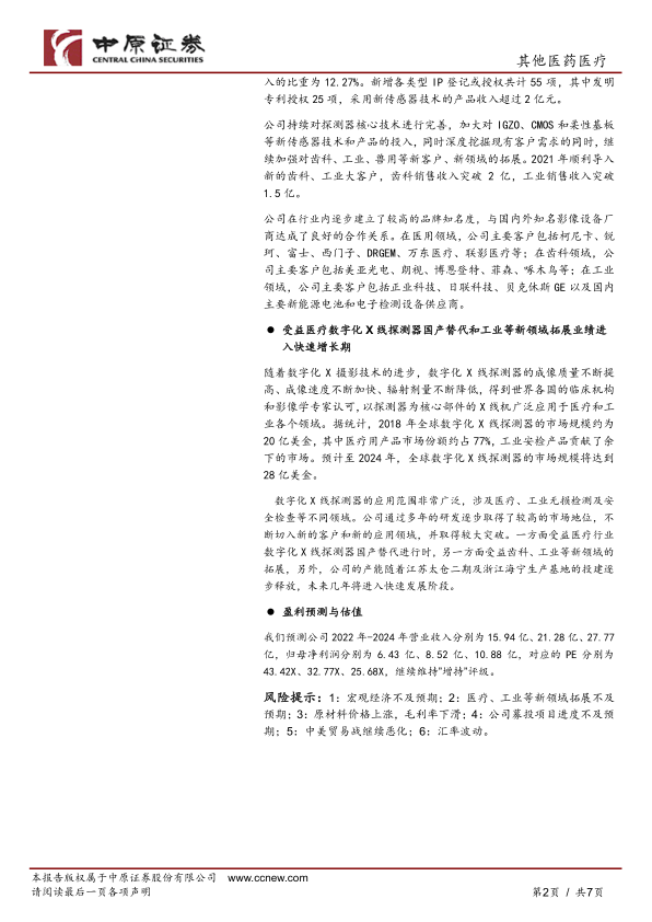 数字化 X 线探测器的应用范围非常广泛,涉及医疗、工业无损检测及安全检查等不同领域。公司通过多年的研发逐步取得了较高的市场地位,不断切入新的客户和新的应用领域,并取得较大突破。一方面受益医疗行业数字化 X 线探测器国产替代进行时,另一方面受益齿科、工业等新领域的拓展,另外,公司的产能随着江苏太仓二期及浙江海宁生产基地的投建逐步释放,未来几年将进入快速发展阶段。