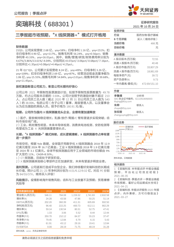 盈利预测: 公司逐渐打造成平台型企业, 我们持续看好奕瑞科技的长期成长价值,预计公司 21-23 年净利润分别为 4.01/6.12/9.02 亿,对应 PE 分别为 84/55/37X,维持买入评级!