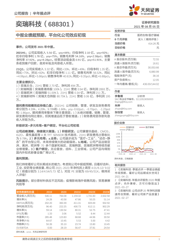 1)奕瑞太仓:21H1营收2.70亿,净利润494万。
