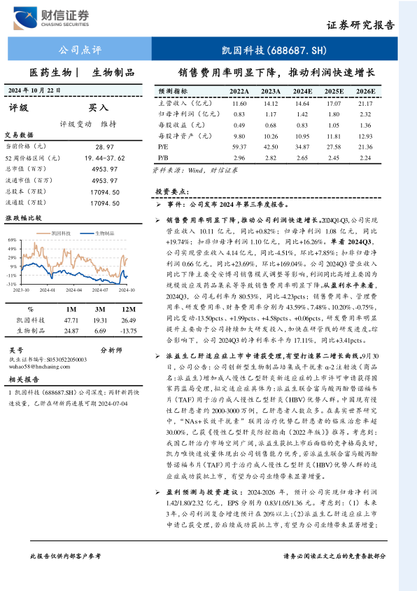 凯因科技在2024年前三季度通过优化销售费用率实现了利润的快速增长,展现了良好的成本控制能力和盈利质量。同时,公司创新药派益生乙肝适应症上市申请的受理,预示着其有望在广阔的乙肝治疗市场中开辟第二增长曲线,为未来业绩提供强劲支撑。基于对公司未来三年超过20%的利润复合增速预期以及新产品带来的增长潜力,财信证券维持“买入”评级,并给出了具有吸引力的目标价格区间。投资者需关注行业政策、市场竞争及产品研发销售进展等潜在风险。