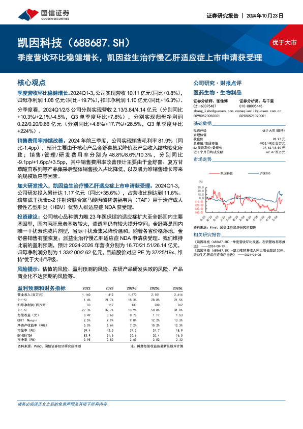 凯因科技在2024年前三季度展现出稳健的经营态势,营收和归母净利润均实现增长,尤其第三季度盈利能力显著改善。公司通过有效的费用控制,特别是销售费用率的优化,提升了整体运营效率。同时,公司持续加大研发投入,并在慢性乙型肝炎治疗领域取得了关键性进展,培集成干扰素α-2注射液联合富马酸丙酚替诺福韦片(TAF)的新适应症上市申请获受理,为未来增长奠定基础。核心产品凯力唯和金舒喜的市场潜力,结合新产品的研发进展,支撑了国信证券对其“优于大市”的投资评级和积极的盈利预测。投资者在关注公司发展潜力的同时,也应警惕相关的市场和研发风险。