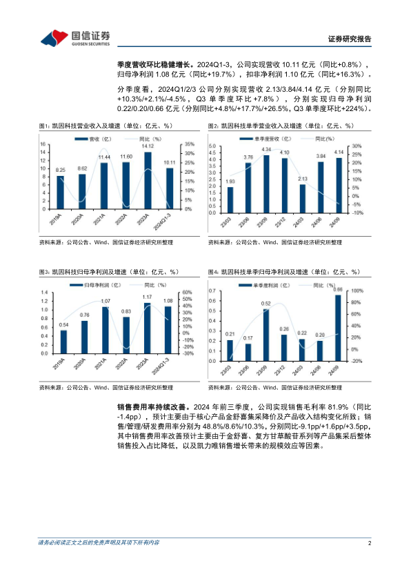 凯因科技在2024年前三季度实现了营收和归母净利润的稳健增长,其中归母净利润同比大幅提升19.7%。公司通过优化销售策略,显著降低了销售费用率,从而改善了整体盈利能力,尽管毛利率因核心产品集采降价略有下降。