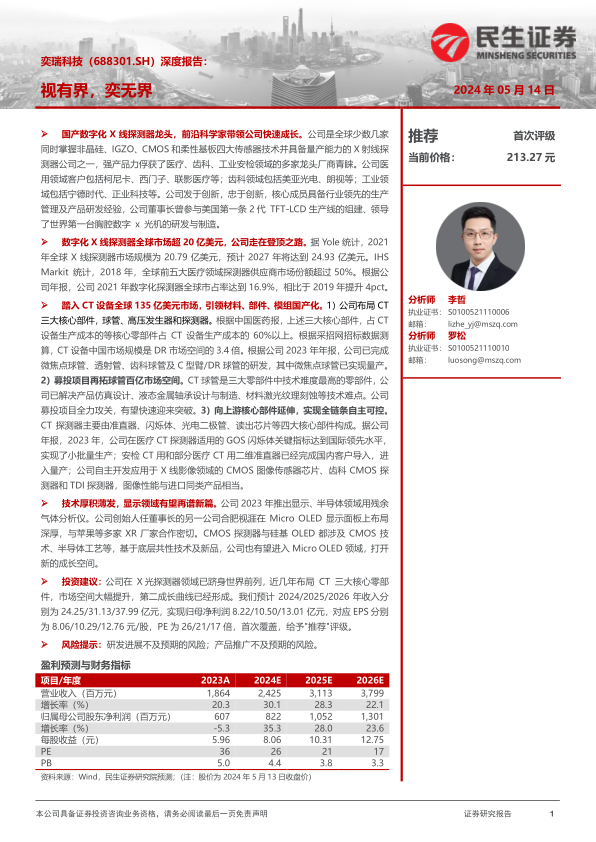 根据民生证券研究院预测,奕瑞科技2024/2025/2026年收入将分别达到24.25/31.13/37.99亿元,实现归母净利润8.22/10.50/13.01亿元,对应EPS分别为8.06/10.29/12.76元/股。增长主要来源于探测器业务的快速增长、核心部件及原材料的放量(同时降低自有产品成本),以及客户端整体解决方案产品进入放量期。