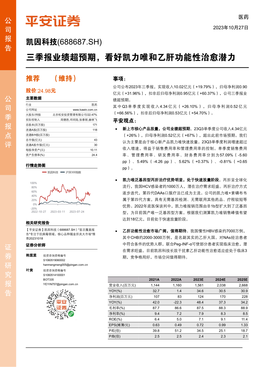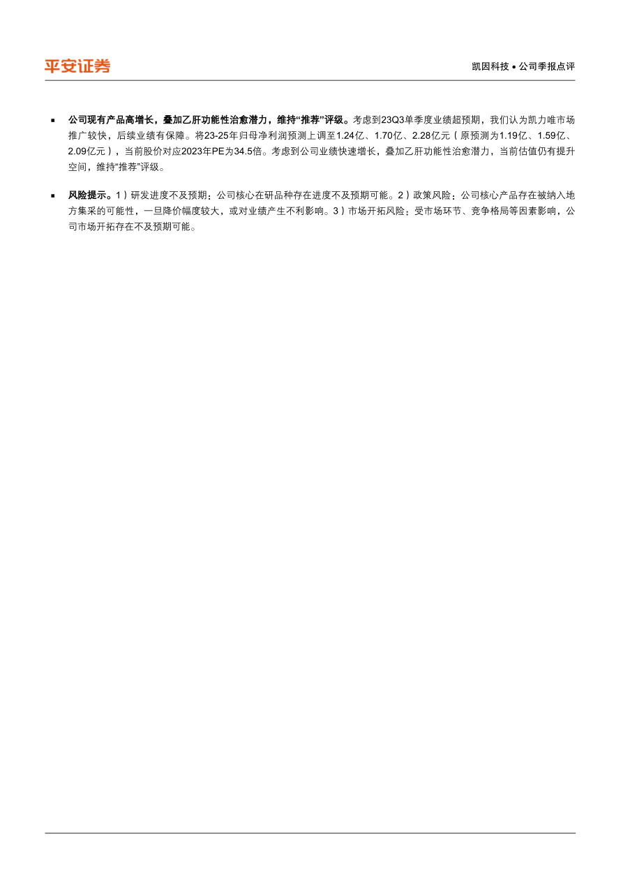 公司现有产品高增长,叠加乙肝功能性治愈潜力,维持“推荐”评级。考虑到23Q3单季度业绩超预期,我们认为凯力唯市场推广较快,后续业绩有保障。将23-25年归母净利润预测上调至1.24亿、1.70亿、2.28亿元(原预测为1.19亿、1.59亿、2.09亿元),当前股价对应2023年PE为34.5倍。考虑到公司业绩快速增长,叠加乙肝功能性治愈潜力,当前估值仍有提升空间,维持“推荐”评级。