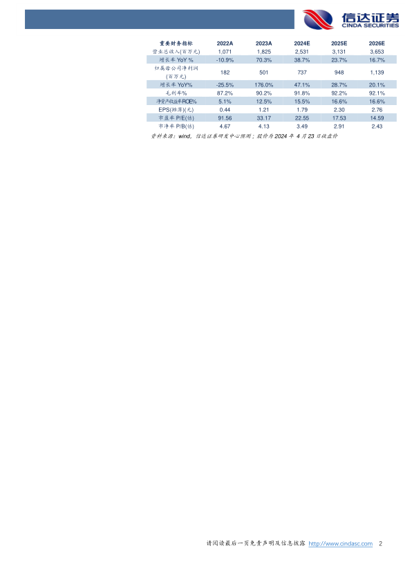 预计公司2024-2026年营业收入分别为25.31亿元、31.31亿元、36.53亿元,同比增速分别为39%、24%、17%;归母净利润为7.37亿元、9.48亿元、11.39亿元,同比分别增长47%、29%、20%,对应2024/4/23股价的PE分别为23倍、18倍、15倍。