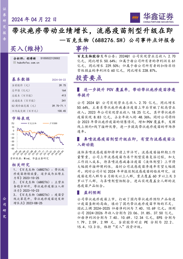 公司带状疱疹疫苗上市,打破了国内带状疱疹预防产品由进口疫苗垄断的局面,填补了国内带状疱疹疫苗市场的不足,因此上调2024-2025归母净利润为7.40、10.69亿元。预测公司2024-2026年收入分别为23.06、31.85、37.50亿元,归母净利润分别为7.40、10.69、12.34亿元,EPS分别为1.79、2.59、2.99元,当前股价对应PE分别为22.2、15.4、13.3倍,维持“买入”投资评级。