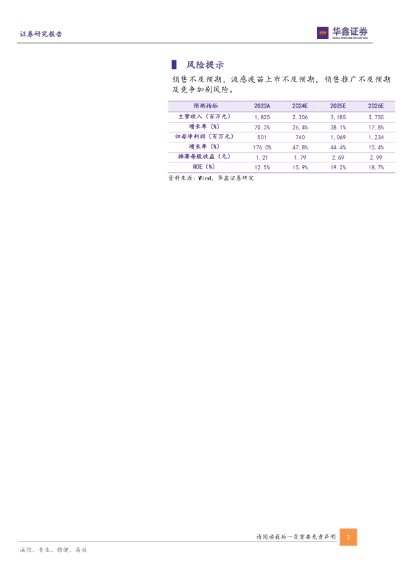 销售不及预期,流感疫苗上市不及预期,销售推广不及预期及竞争加剧风险。
