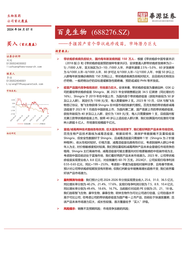 本报告对百克生物进行了首次覆盖,核心逻辑在于其手握国产首个带状疱疹疫苗,市场潜力巨大。报告分析了带状疱疹疾病负担和疫苗市场竞争格局,认为公司产品具有显著优势。通过盈利预测和估值分析,认为公司成长性较强,给予“买入”评级。但同时也提示了销售不及预期和市场竞争加剧的风险。