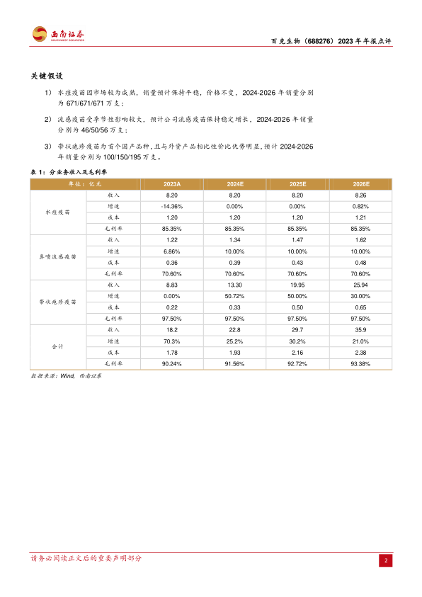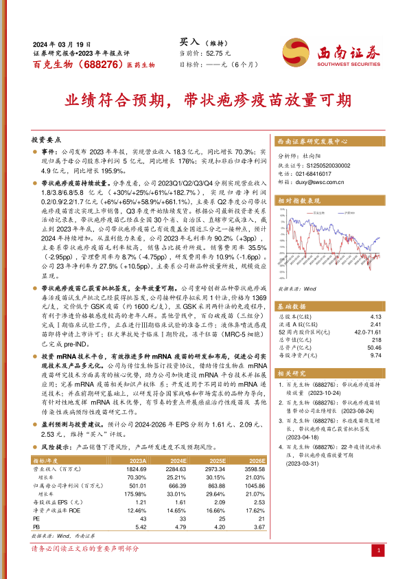 百克生物2023年年报显示,公司业绩实现强劲增长,营业收入和归母净利润分别同比增长70.3%和176%,主要得益于带状疱疹疫苗的成功上市和市场快速放量。带状疱疹疫苗凭借其单针接种和更具竞争力的价格策略,已迅速在全国范围内建立市场准入和覆盖,预计将持续作为公司未来业绩增长的核心驱动力,并显著提升整体毛利率。公司在现有疫苗产品线(如百白破、流感、狂犬等)的研发方面持续推进,并战略性投资mRNA技术平台,旨在通过技术创新和产品多元化,增强长期市场竞争力和可持续发展能力。基于对核心产品放量和研发管线进展的积极预期,分析师维持了“买入”评级,并给出了未来三年的盈利预测,但同时提醒投资者关注产品销售和研发进度可能带来的风险。