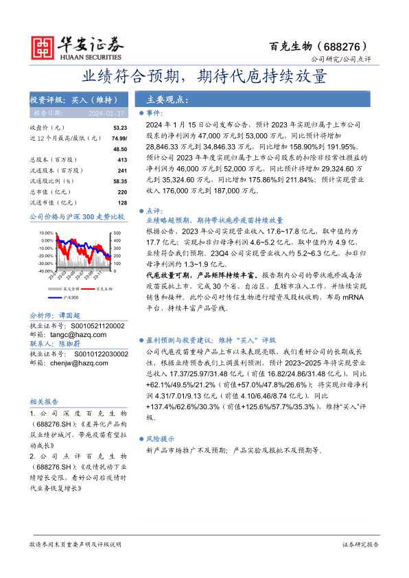 本报告对百克生物的业绩进行了分析,指出公司2023年业绩符合预期,带状疱疹疫苗的放量是业绩增长的重要驱动力。同时,公司积极布局mRNA平台,丰富产品管线,为未来发展奠定基础。