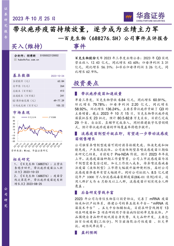 百克生物在2023年第三季度展现出强劲的业绩增长势头,主要得益于带状疱疹疫苗的加速放量和市场覆盖率的稳步提升。公司在流感疫苗领域积极推进剂型升级和产能扩张,以提升市场渗透率并实现全人群覆盖。同时,通过构建mRNA疫苗技术平台和丰富的在研管线,百克生物为未来的持续发展奠定了坚实基础。尽管存在销售不及预期、出生率下滑和新产品上市风险,但分析师对公司未来盈利能力持乐观态度,并维持“买入”评级。