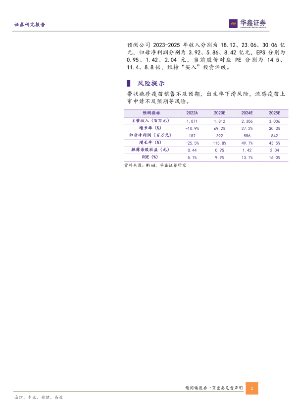 报告提示的风险包括带状疱疹疫苗销售不及预期、出生率下滑风险以及流感疫苗上市申请不及预期等。