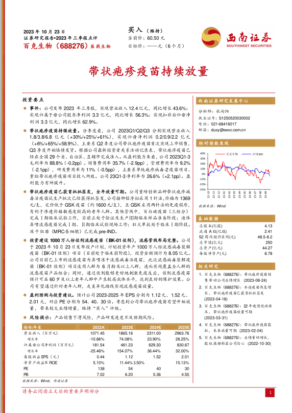 百克生物2023年三季报表现亮眼,主要得益于带状疱疹疫苗的成功上市和快速放量。公司在疫苗领域的研发实力和市场拓展能力值得肯定。带状疱疹疫苗凭借其价格优势和市场先入优势,有望在未来几年内成为公司业绩增长的主要驱动力。同时,公司在流感疫苗等其他管线的积极布局,也为未来的发展奠定了基础。维持“买入”评级,但需关注产品销售和研发进度等风险因素。