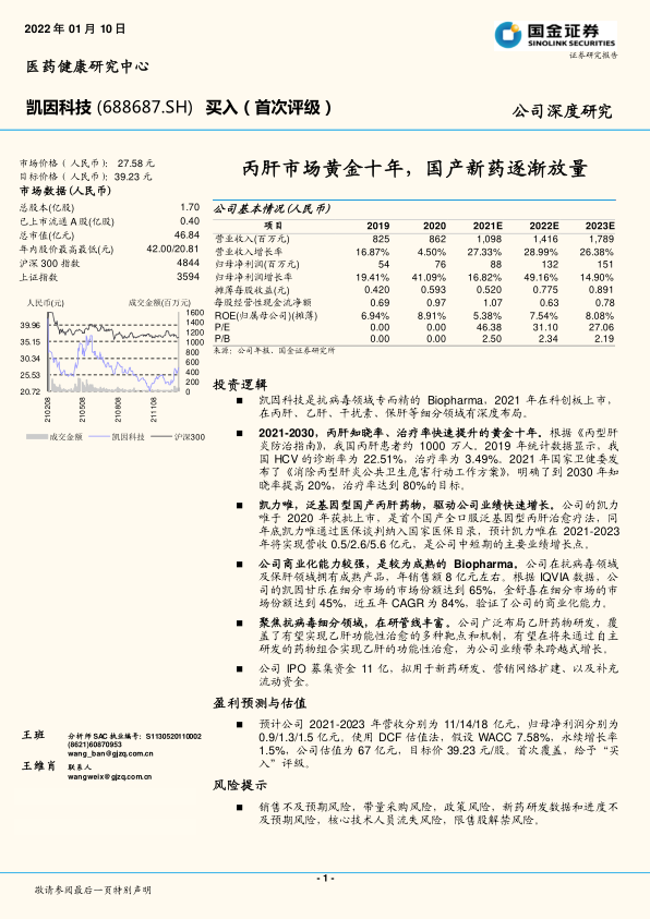 本报告分析了凯因科技在丙肝和乙肝领域的市场前景和竞争优势。公司凭借其国产丙肝新药凯力唯,有望在未来十年丙肝知晓率和治疗率快速提升的黄金时期,实现业绩的快速增长。同时,公司在乙肝领域的全方位布局,有望在未来通过自主研发的药物组合实现乙肝的功能性治愈,为公司业绩带来跨越式增长。基于DCF估值法,本报告首次覆盖给予“买入”评级,目标价为39.23元/股。