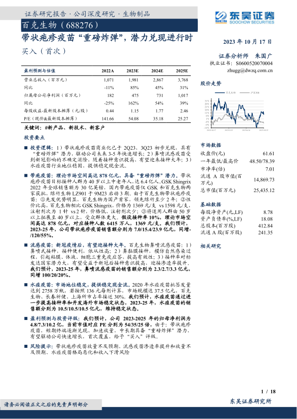 盈利预测与投资评级: 我们预计,公司 2023-2025 年的归母净利润为4.8/7.3/10.2 亿, 当前市值对应 PE 分别为 54/35/25 倍, 由于:带状疱疹疫苗,短期终端逐渐兑现、加速放量,中长期具备“重磅炸弹”潜力,有望驱动公司快速增长,首次覆盖,给予“买入”评级。