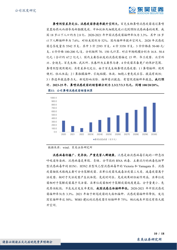 流感疫苗:新冠疫情后,有望迎接种大年。 百克生物鼻喷流感疫苗: 1)鼻喷式接种,接种便利,依从性高; 2)鼻黏膜接种,模仿自然感染过程,引起粘膜、体液、细胞三重免疫应答,提高有效性; 3) 接种率对标发达国家潜力大, 有望受益于新冠后接种意识提高, 迎接渗透率提升。我们预计, 2023-25 年,鼻喷流感疫苗的销售额分别为 2.3/2.7/3.3 亿元,同增 100/20/20%。