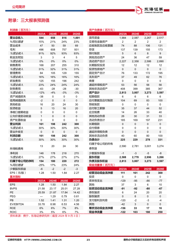投资建议:公司积极布局海外市场,常规业务保持快速增长,苏州GMP厂房进入试生产我们预计2024-2026年实现营收6.58亿元、8.16亿元、10.01亿元,实现归母净利润1.80亿元、2.20亿元、2.72亿元,对应EPS分别为1.50、1.84、2.27元/股,对应PE分别为21.87倍/17.84倍/14.42倍。维持“买入”评级。