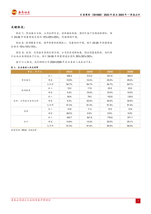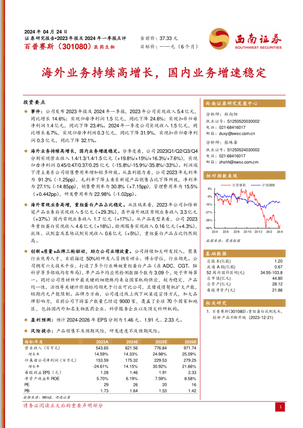 本报告对百普赛斯(301080)2023年报及2024年一季报进行了分析,核心观点如下: