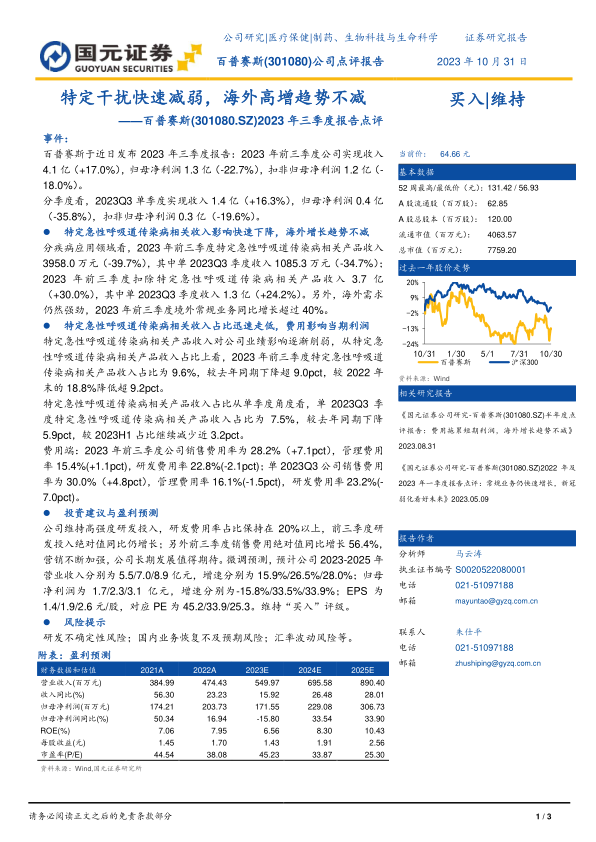 百普赛斯在特定急性呼吸道传染病相关收入影响逐渐减弱的情况下,常规业务展现出强劲的增长势头,尤其海外市场表现亮眼。公司持续加大研发投入和市场营销力度,为长期发展奠定基础。虽然短期内费用上升对利润造成一定影响,但考虑到公司未来的增长潜力,维持“买入”评级。投资者应关注研发不确定性、国内业务恢复不及预期以及汇率波动等风险。