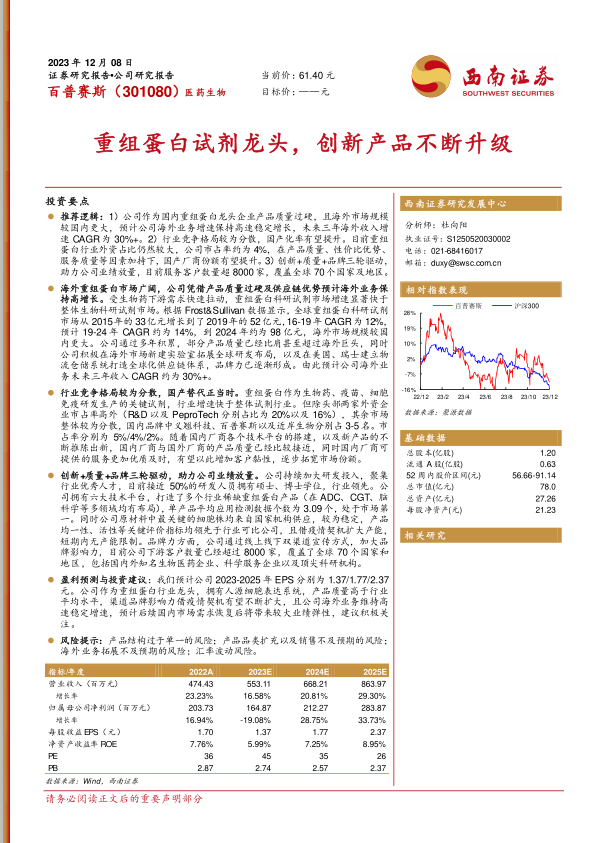 盈利预测与投资建议:我们预计公司2023-2025年EPS分别为1.37/1.77/2.37元。公司作为重组蛋白行业龙头,拥有人源细胞表达系统,产品质量高于行业平均水平,渠道品牌影响力借疫情契机有望不断扩大,且公司海外业务维持高速稳定增速,预计后续国内市场需求恢复后将带来较大业绩弹性,建议积极关注。