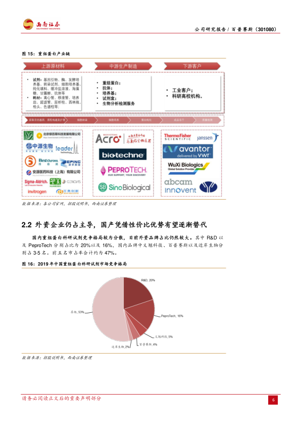 行业竞争格局较为分散,国产替代正当时。重组蛋白作为生物药、疫苗、细胞免疫研发生产的关键试剂,行业增速快于整体试剂行业。但除头部两家外资企业市占率高外(R&D以及PeproTech分别占比为20%以及16%),其余市场整体较为分散,国内品牌中义翘科技、百普赛斯以及近岸生物分别占3-5名。市占率分别为5%/4%/2%。随着国内厂商各个技术平台的搭建,以及新产品的不断推陈出新,国内厂商与国外厂商的产品质量已经比较接近,同时国内厂商可提供的服务更加优质及时,有望以此增加客户黏性,逐步拓宽市场份额。