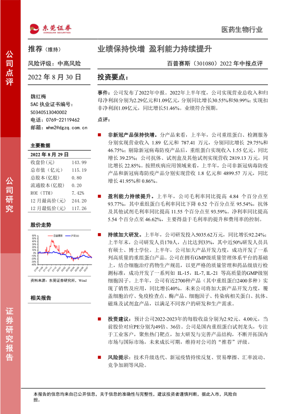 投资建议:预计公司2022-2023年的每股收益分别为2.92元、4.00元,当前股价对应PE分别为49倍、36倍。公司是国内重组蛋白试剂龙头,专注于工业客户,聚焦热门靶点,加大研发与完善产品结构,不断开拓国内市场与国际市场,未来成长可期,维持对公司的“推荐”评级。
