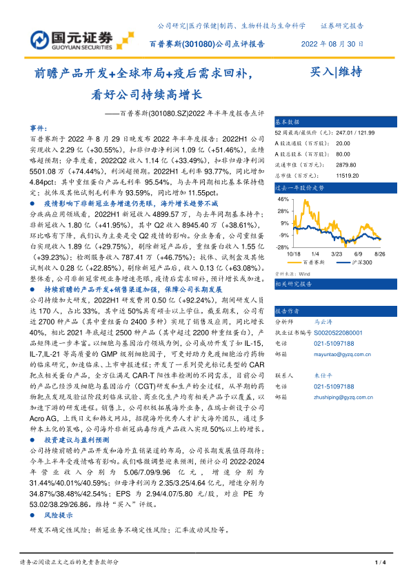百普赛斯2022年上半年业绩表现超出市场预期,尤其在非新冠业务领域展现出强劲的增长势头,这得益于公司持续的研发投入、不断丰富的产品线(特别是细胞与基因治疗领域)以及积极的全球市场拓展策略。尽管面临疫情和潜在的研发、汇率波动风险,但公司前瞻性的战略布局和核心业务的内生增长动力,为其未来的持续高增长奠定了坚实基础。基于此,国元证券维持对百普赛斯的“买入”评级,并对其未来几年的营收和净利润增长持乐观态度。