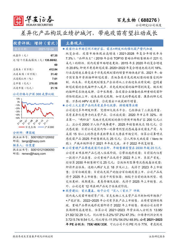 国内成人疫苗市场前景广阔,百克生物三大主营产品不断加码市场推广+产能扩张,2022~2025年公司有多款产品上市销售,业绩有望持续爬坡。重磅产品带状疱疹疫苗即将于2022年上市销售,驱动公司业绩中长期持续高速增长。估算公司2021~2023年营业收入分别为13.95/21.92/32.29亿元,同比增长-3.2%/57.2%/47.3%;归母净利润分别为3.72/5.74/8.54亿元,同比增长-11.0%/54.0%/48.9%;公司2021~2023年PE分别为:75X/49X/33X。可比公司平均PE约为77X。考虑到疫苗行业的持续快速发展、公司流感、水痘和带状疱疹疫苗的差异优势以及接下来几年重磅产品接连上市带来的长期成长性,我们首次覆盖,给予公司“买入(首次)”评级。