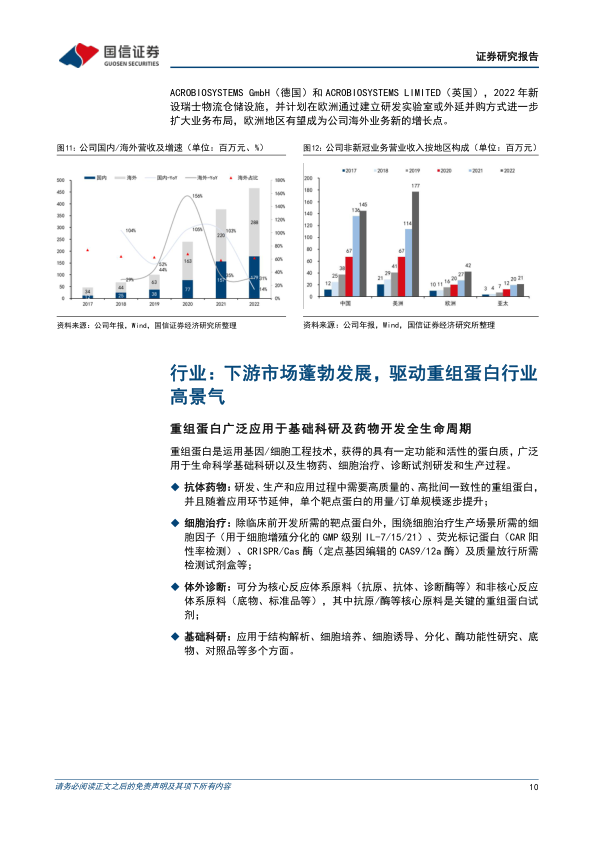 下游市场蓬勃发展,驱动重组蛋白行业高景气。重组蛋白广泛用于生命科学基础科研以及生物药、细胞治疗、诊断试剂研发和生产过程,受益于下游医药生物产业及科研旺盛需求,重组蛋白试剂行业快速发展。以Bio-Techne为代表的海外先发企业通过并购不断扩大业务版图,目前已形成“生物试剂+仪器+诊断”一体化平台。国内行业处于发展早期阶段,以新冠疫情为契机,对外国际化步伐加速、对内国产替代提升市场份额;国内企业目前启动新一轮扩张周期,预计短期成本端略承压,中长期有望实现规模效应。