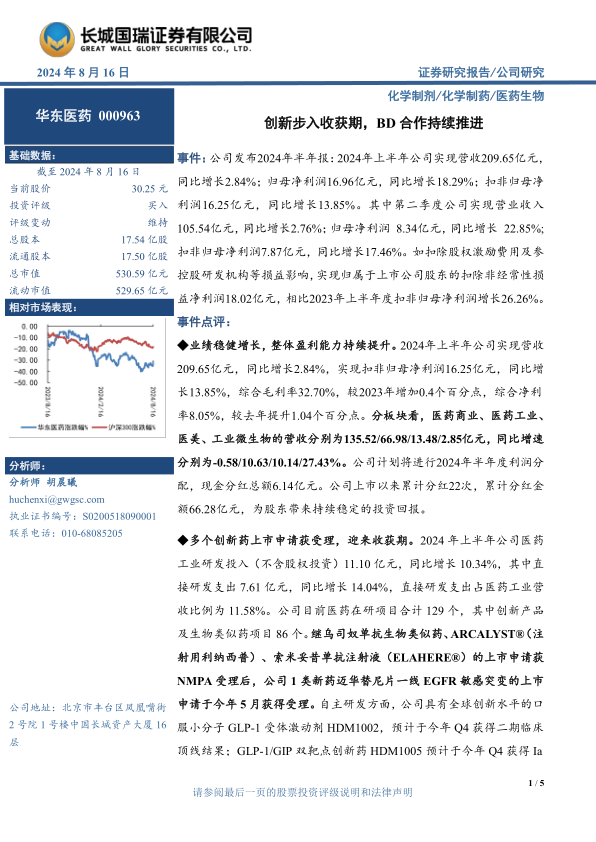 华东医药2024年上半年业绩稳健增长,盈利能力持续提升。医药工业方面,研发投入增加,多个创新药进入收获期,BD合作项目顺利推进,为公司未来发展奠定坚实基础。医美板块表现良好,尽管Sinclair业绩有所下滑,但欣可丽美学保持增长,产品组合丰富,市场覆盖范围广。维持“买入”评级,但需关注医药政策风险、新药研发上市进度以及产品降价风险。