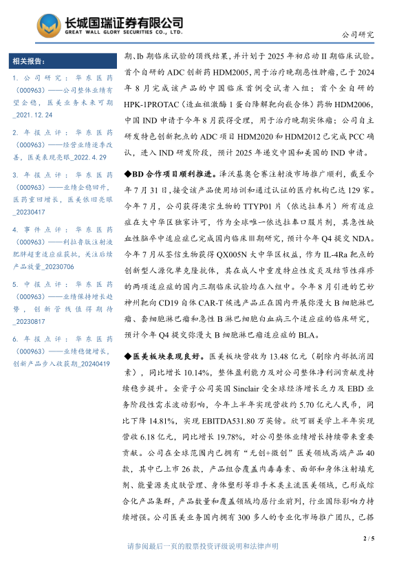 多个创新药上市申请获受理,迎来收获期。2024年上半年公司医药工业研发投入(不含股权投资)11.10亿元,同比增长10.34%,其中直接研发支出7.61亿元,同比增长14.04%,直接研发支出占医药工业营收比例为11.58%。公司目前医药在研项目合计129个,其中创新产品及生物类似药项目86个。继乌司奴单抗生物类似药、ARCALYST?(注射用利纳西普)、索米妥昔单抗注射液(ELAHERE?)的上市申请获NMPA受理后,公司1类新药迈华替尼片一线EGFR敏感突变的上市申请于今年5月获得受理。自主研发方面,公司具有全球创新水平的口服小分子GLP-1受体激动剂HDM1002,预计于今年Q4获得二期临床顶线结果;GLP-1/GIP双靶点创新药HDM1005预计于今年Q4获得Ia期、Ib期临床试验的顶线结果,并计划于2025年初启动II期临床试验。首个自研的ADC创新药HDM2005,用于治疗晚期恶性肿瘤,已于2024年8月完成该产品的中国临床首例受试者入组;首个全自研的HPK-1PROTAC(造血祖激酶1蛋白降解靶向嵌合体)药物HDM2006,中国IND申请于今年8月获得受理,用于治疗晚期实体瘤;公司自主研发特色创新靶点的ADC项目HDM2020和HDM2012已完成PCC确认,进入IND研发阶段,预计2025年递交中国和美国的IND申请。