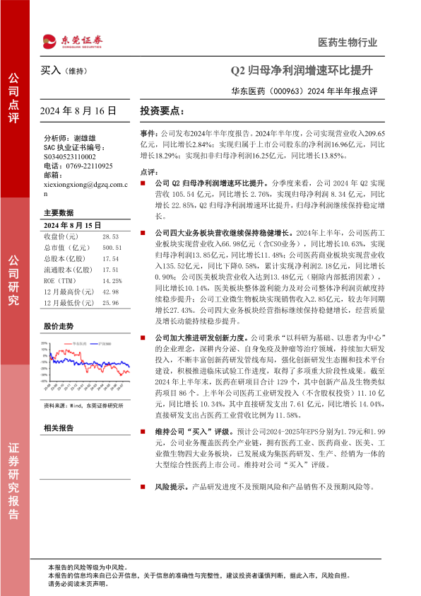本报告分析了华东医药2024年半年度报告,公司Q2归母净利润增速环比提升,四大业务板块营收保持稳健增长,经营质量和增长动能持续提升。公司持续加大研发投入,丰富创新药研发管线布局,强化创新研发生态圈和技术平台建设。维持对公司“买入”评级。同时,报告也提示了产品研发进度不及预期和产品销售不及预期等风险。