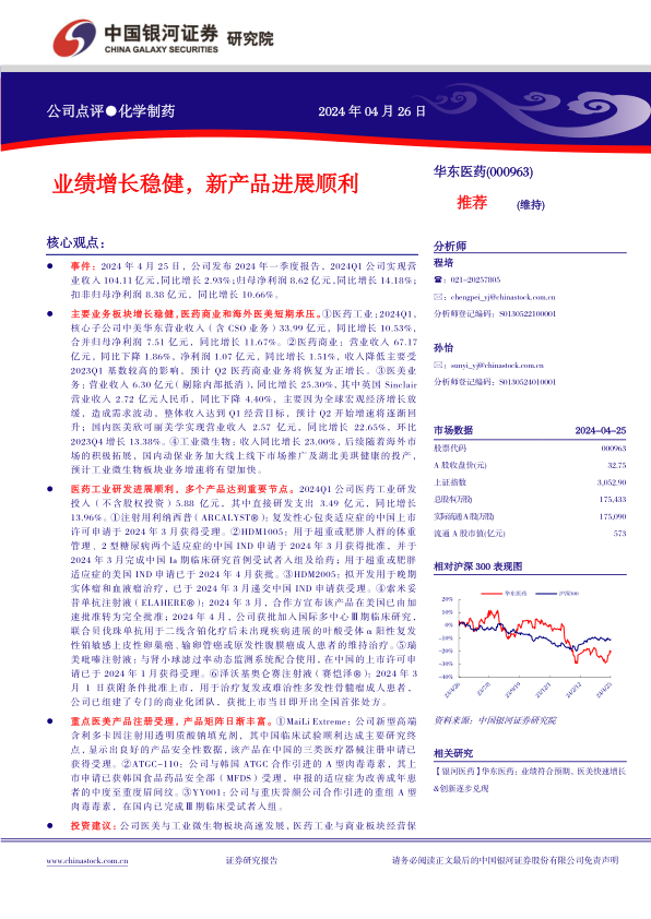 主要业务板块增长稳健,医药商业和海外医美短期承压。①医药工业:2024Q1,核心子公司中美华东营业收入(含CSO业务)33.99亿元,同比增长10.53%,合并归母净利润7.51亿元,同比增长11.67%。②医药商业:营业收入67.17亿元,同比下降1.86%,净利润1.07亿元,同比增长1.51%,收入降低主要受2023Q1基数较高的影响,预计Q2医药商业业务将恢复为正增长。③医美业务:营业收入6.30亿元(剔除内部抵消),同比增长25.30%,其中英国Sinclair营业收入2.72亿元人民币,同比下降4.40%,主要因为全球宏观经济增长放缓,造成需求波动,整体收入达到Q1经营目标,预计Q2开始增速将逐渐回升;国内医美欣可丽美学实现营业收入2.57亿元,同比增长22.65%,环比2023Q4增长13.38%。④工业微生物:收入同比增长23.00%,后续随着海外市场的积极拓展,国内动保业务加大线上线下市场推广及湖北美琪健康的投产,预计工业微生物板块业务增速将有望加快。