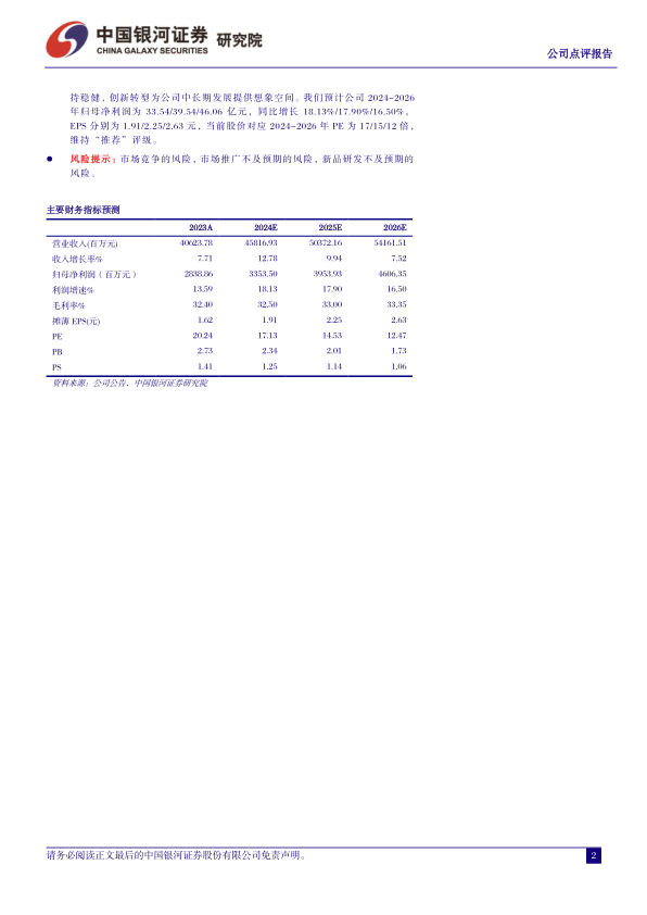投资建议:公司医美与工业微生物板块高速发展,医药工业与商业板块经营保持稳健,创新转型为公司中长期发展提供想象空间。我们预计公司2024-2026年归母净利润为33.54/39.54/46.06亿元,同比增长18.13%/17.90%/16.50%,EPS分别为1.91/2.25/2.63元,当前股价对应2024-2026年PE为17/15/12倍,维持“推荐”评级。