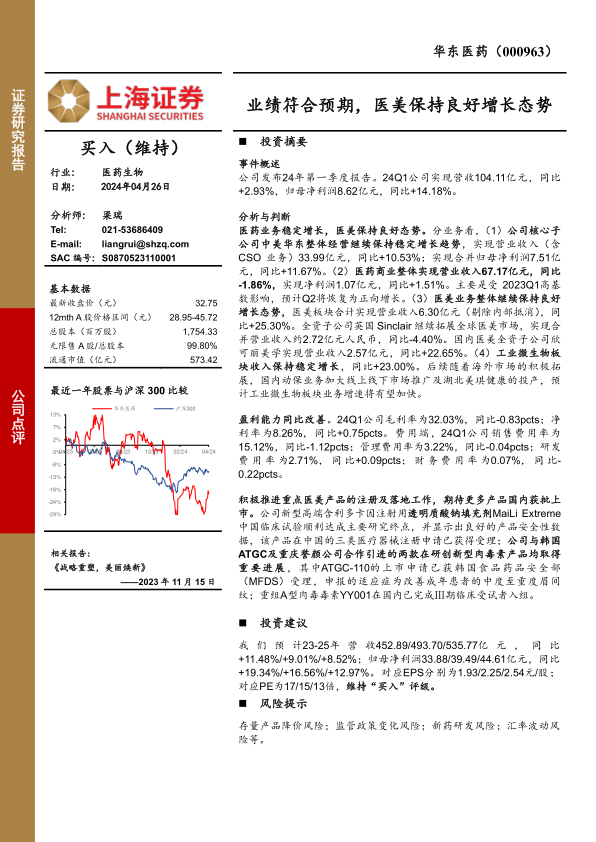 医药业务稳定增长,医美保持良好态势。分业务看,(1)公司核心子公司中美华东整体经营继续保持稳定增长趋势,实现营业收入(含CSO业务)33.99亿元,同比+10.53%;实现合并归母净利润7.51亿元,同比+11.67%。(2)医药商业整体实现营业收入67.17亿元,同比-1.86%,实现净利润1.07亿元,同比+1.51%。主要是受2023Q1高基数影响,预计Q2将恢复为正向增长。(3)医美业务整体继续保持良好增长态势,医美板块合计实现营业收入6.30亿元(剔除内部抵消),同比+25.30%。全资子公司英国Sinclair继续拓展全球医美市场,实现合并营业收入约2.72亿元人民币,同比-4.40%。国内医美全资子公司欣可丽美学实现营业收入2.57亿元,同比+22.65%。(4)工业微生物板块收入保持稳定增长,同比+23.00%。后续随着海外市场的积极拓展,国内动保业务加大线上线下市场推广及湖北美琪健康的投产,预计工业微生物板块业务增速将有望加快。