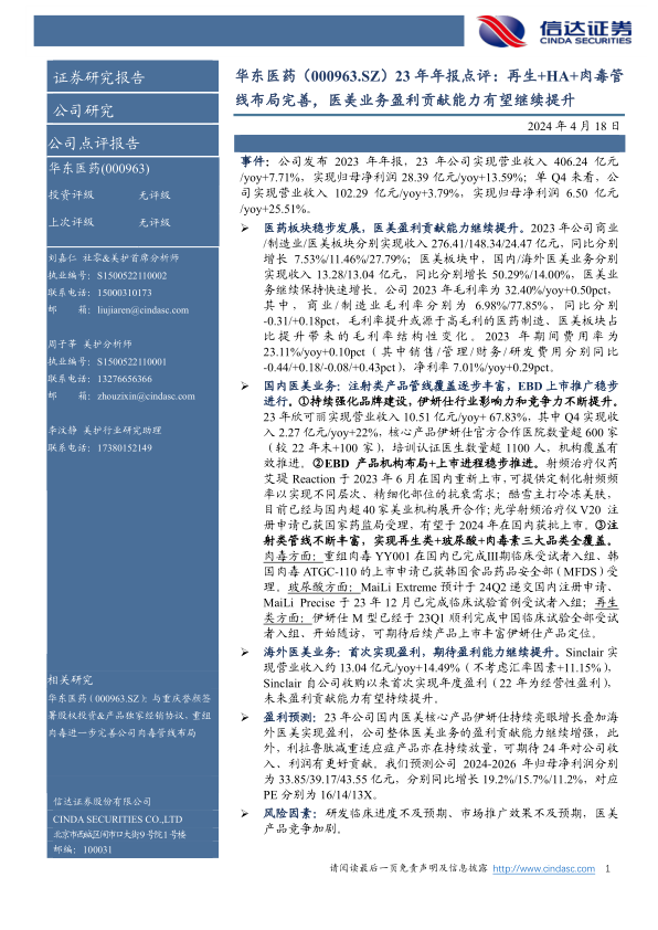 本报告对华东医药(000963.SZ)2023年年报进行了深入分析,核心观点如下: