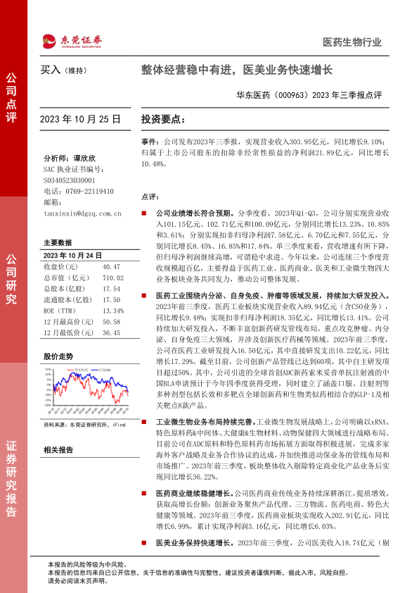 华东医药2023年三季报显示,公司营业收入和扣非归母净利润均实现稳健增长,符合市场预期。医药工业、医药商业、医美和工业微生物四大业务板块共同发力,推动公司整体发展。