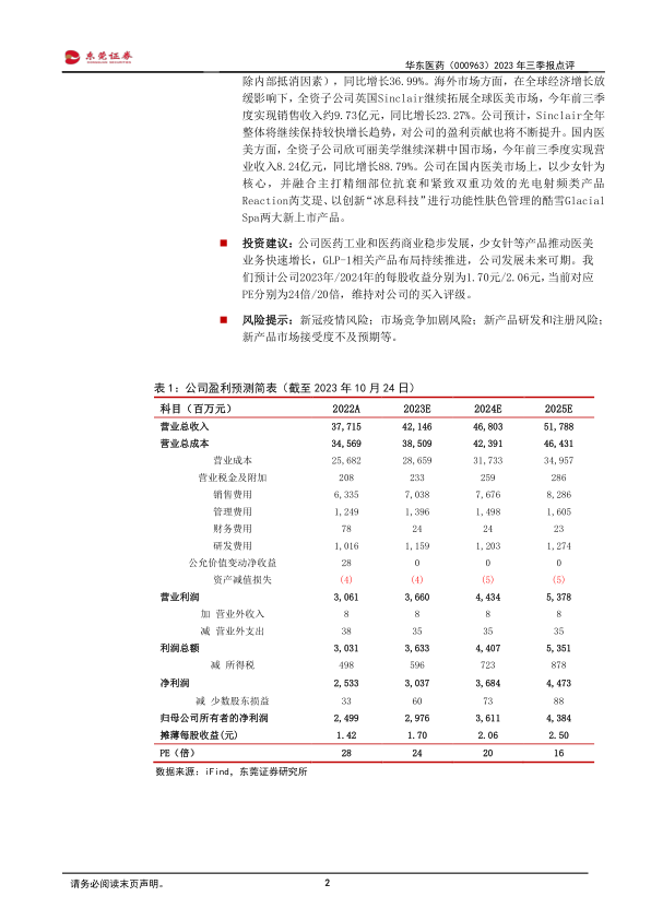 投资建议:公司医药工业和医药商业稳步发展,少女针等产品推动医美业务快速增长,GLP-1相关产品布局持续推进,公司发展未来可期。我们预计公司2023年/2024年的每股收益分别为1.70元/2.06元,当前对应PE分别为24倍/20倍,维持对公司的买入评级。