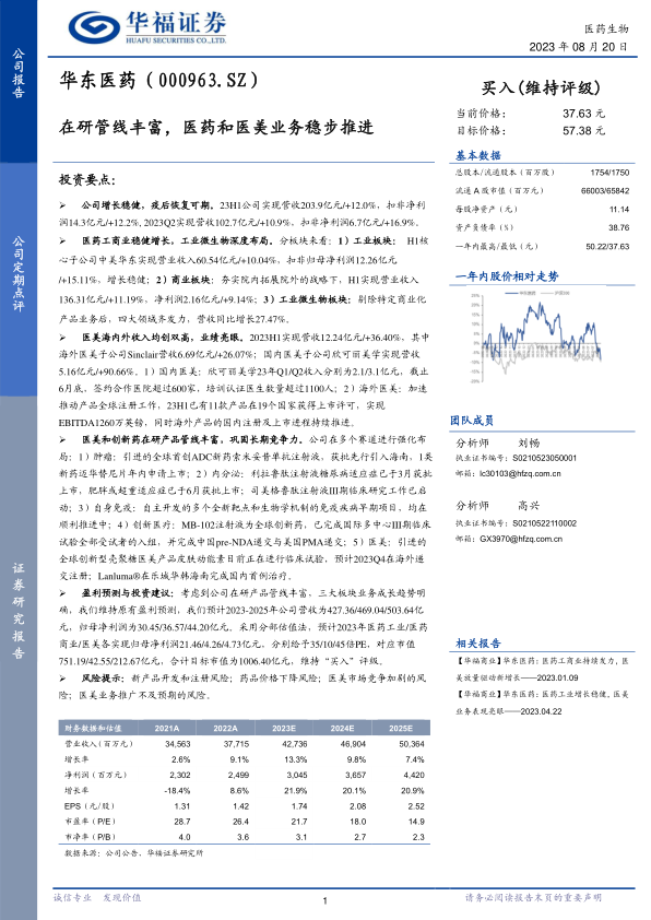 盈利预测与投资建议:考虑到公司在研产品管线丰富,三大板块业务成长趋势明确,我们维持原有盈利预测,我们预计2023-2025年公司营收为427.36/469.04/503.64亿元,归母净利润为30.45/36.57/44.20亿元。采用分部估值法,预计2023年医药工业/医药商业/医美各实现归母净利润21.46/4.26/4.73亿元,分别给予35/10/45倍PE,对应市值751.19/42.55/212.67亿元,合计目标市值为1006.40亿元,维持“买入”评级。