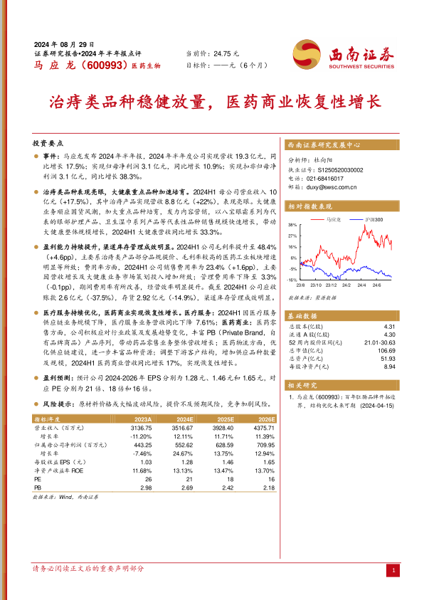 本报告对马应龙(600993)2024年半年报进行了深度分析,核心观点如下: