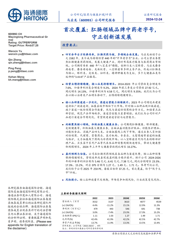 公司在肛肠用药领域具备品牌与渠道优势,核心品种销售保持稳健增长,营销效率改善促进盈利能力稳步提升。预计公司2024-2026年的归母净利润分别为5.46亿元、6.41亿元、7.38亿元,同比分别增长23.3%、17.3%、15.2%,对应EPS分别为1.27元、1.49元、1.71元。参考可比公司,给予公司2025年25X PE,每股目标价37.25元,首次覆盖,给予“优于大市”评级。
