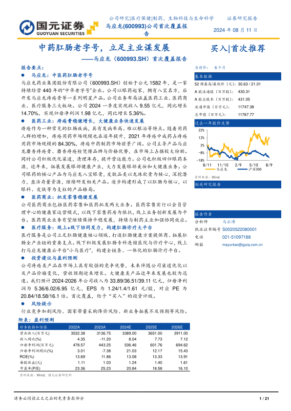 基于公司在痔疮用药市场的强大竞争优势、大健康业务的快速增长潜力以及医疗服务板块的协同效应,国元证券首次覆盖并给予“买入”投资评级。预计2024-2026年公司收入将分别达到33.89亿元、36.51亿元和39.11亿元,归母净利润分别为5.36亿元、6.02亿元和6.95亿元,对应EPS分别为1.24元/股、1.40元/股和1.61元/股。尽管当前市盈率高于可比公司平均水平,但考虑到公司产品的提价空间、庞大的患者群体以及新业务的业绩增量,公司具备长期投资价值。