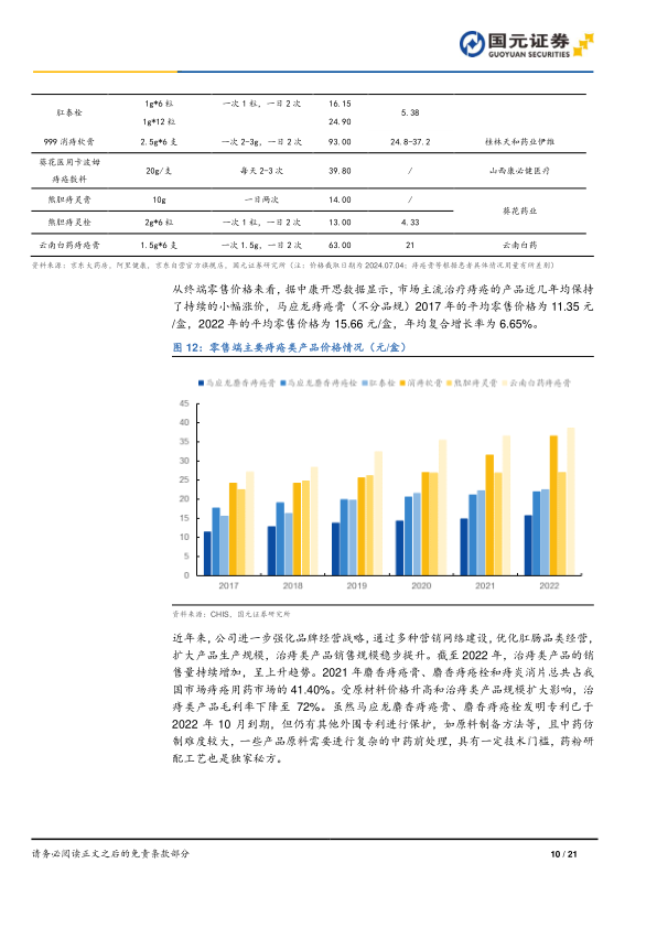 公司治痔类产品具有显著的价格优势,日用药金额相对较低,且价格体系稳定,为未来提价提供了空间。2017年至2022年,马应龙痔疮膏平均零售价格从11.35元/盒增长至15.66元/盒,年均复合增长率达6.65%。尽管马应龙麝香痔疮膏、麝香痔疮栓的发明专利已于2022年10月到期,但公司仍通过其他外围专利和复杂的中药前处理、独家研配工艺等技术门槛进行保护。截至2022年,治痔类产品销售量持续增长,2021年麝香痔疮膏、麝香痔疮栓和痔炎消片合计占我国痔疮用药市场的41.40%。
