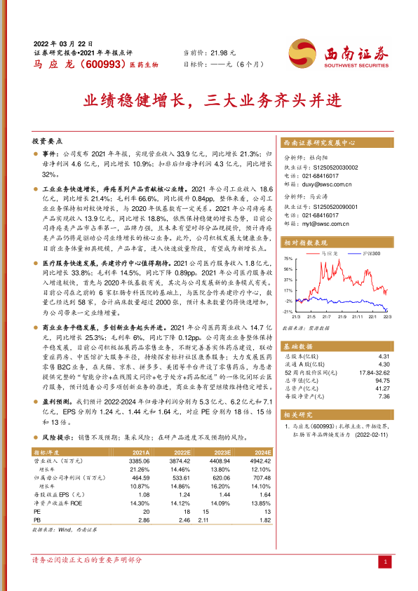 马应龙2021年年报显示公司业绩稳健增长,三大业务齐头并进。痔疮系列产品作为核心业务,市场领先地位稳固,大健康业务和医疗服务业务发展迅速,有望成为新的增长点。公司商业业务平稳发展,并积极拓展创新业务。维持盈利预测,但需关注相关风险。