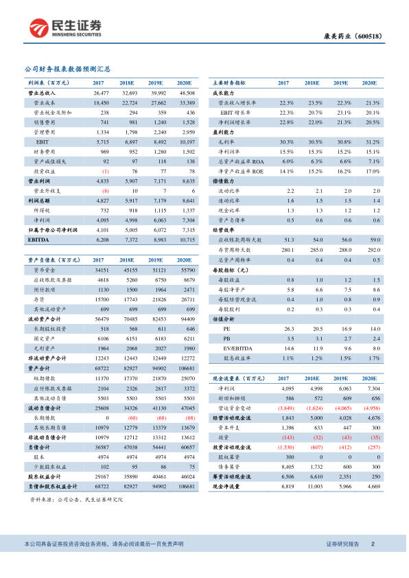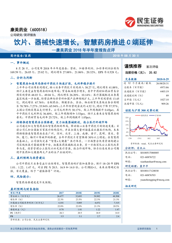 公司中药饮片业务受益于行业性增长,智慧药房的扩张加速了整合。预计公司2018年至2020年每股收益(EPS)分别为1.01元、1.22元和1.47元,对应市盈率(PE)分别为20.5倍、16.9倍和14.0倍。公司PEG小于1,未来业绩确定性强。首次覆盖,给予“谨慎推荐”评级。