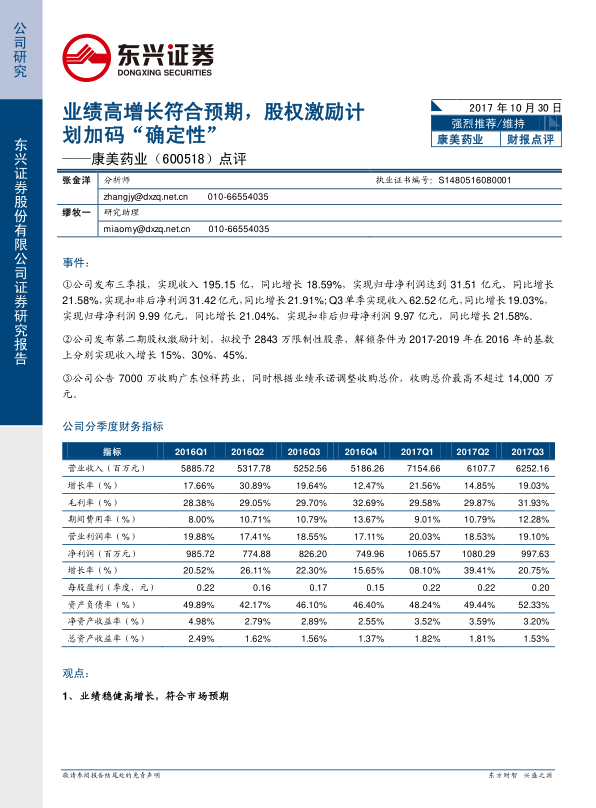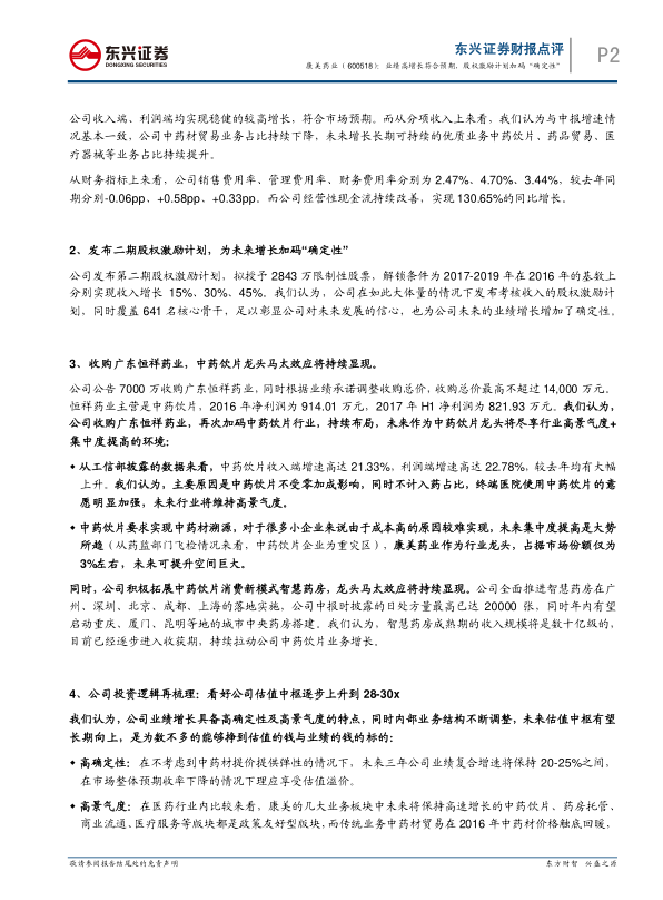 本报告分析了康美药业的三季报业绩,认为公司业绩稳健增长,符合市场预期。公司通过股权激励计划和收购广东恒祥药业等举措,进一步增强了增长的确定性。报告还梳理了公司的投资逻辑,认为公司具备高确定性和高景气度的特点,估值中枢有望长期向上,维持“强烈推荐”评级。